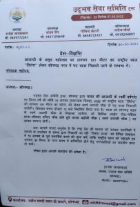आजादी के अमृत महोत्सव पर 151 मीटर तिरंगा लेकर नगर में पदयात्रा उद्भव सेवा समिति ट्रस्ट सोनभद्र द्वारा आजादी के 75 वी वर्षगांठ पर विगत वर्षों की भांति स्वतंत्रता दिवस पर 151 मीटर तिरंगा लेकर पदयात्रा करेगी जो स्वर्ण जयंती चौक से निकलकर सिविल लाइन रोड होकर महिला थाना शीतला चौक पर सम्पन्न होगी जिसका समय दोपहर 12:00 बजे निर्धारित किया गया है जानकारी सेवा समिति ट्रस्ट के अध्यक्ष राजेश जायसवाल ने प्रेस विज्ञप्ति जारी कर दिया!