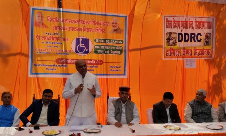 सिद्धार्थ नगर। कपिलवस्तु विधानसभा के जय किसान इंटर कॉलेज सकतपुर सनई में आयोजित दिव्यांगजन सशक्तिकरण विभाग द्वारा सहायक उपकरण वितरण शिविर का आयोजन किया गया जिसके मुख्य अतिथि सांसद जगदंबिका पाल रहे सांसद जगदंबिका पाल दिव्यांग जनों से संवाद किया और सहायक उपकरण वितरित किया और कहा हमारी सरकार आप लोगो को आर्थिक और सामाजिक पुनर्वास को सुगम बनाने के लिए तथा आप लोगों को दैनिक जीवन में अधिक स्वतंत्रता और भागीदारी मिल सके इसके लिए अनेक योजनाएं लेकर आती है और कहां आपका सांसद आपके सुख दुख में हमेशा शामिल है जब दिव्यांगजनों की बात आती है तो मैं कहीं भी रहूं आप लोगों के बीच में जरूर पहुंचता हूं उन्होंने कहा मैं देश के लिए नेता हूं लेकिन आपके लिए आपका बेटा हूं कार्यक्रम में पूर्व जिला अध्यक्ष लालजी त्रिपाठी उर्फ लाल बाबा मुख्य विकास अधिकारी जयेंद्र कुमार मंडल अध्यक्ष रमेश मणि त्रिपाठी चिनकू यादव रिंकू पाल अखंड पाल आदि मौजूद रहे।