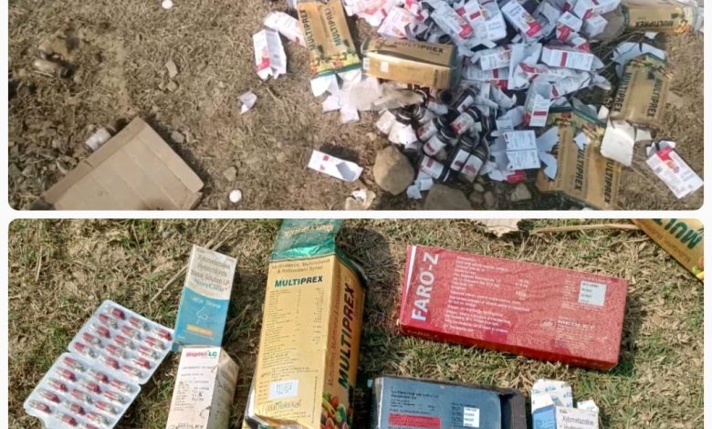 बढ़नी ब्लाक के बगल सरयू राप्ती मुख्य नहर के पटरी पर फेंकी जा रही दवाइयां
