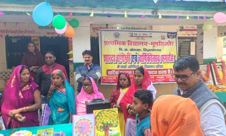 बांसी। शासन के निर्देशानुसार खेसरहा क्षेत्र के प्राथमिक विद्यालय भूपतजोत के परिसर में शारदा संगोष्ठी एवं वार्षिकोत्सव समारोह का आयोजन किया गया। प्रधानाध्यापक धीरज प्रसाद गौड के देखरेख व विद्यालय प्रबन्धन समिति की अध्यक्षा श्रीमती चन्द्रावती तथा उपाध्यक्ष श्रीमती लक्ष्मी की अध्यक्षता में बच्चों व अभिभावकों के साथ आयोजित वार्षिकोत्सव कार्यक्रम शनिवार को हर्षाेल्लास पूर्वक मनाया गया। इस दौरान विद्यालय के विभिन्न गतिविधियों पर चर्चा हुई। चर्चा में सुनिश्चित किया गया कि कोई भी बच्चा आउट आफ स्कूल न हो । इस अवसर पर शिक्षकगण, शिक्षा मित्र, आशा, आंगनबाड़ी के अतिरिक्त राजेन्द्र आदि भी उपस्थित रहे । प्रधानाध्यापक श्री गौड ने कहा कि कार्यक्रम में आयोजित सुलेख, चित्रकला एवं श्रुतिलेख प्रतियोगिता में प्रथम तथा द्वितीय व तृतीय स्थान प्राप्त छात्र छात्राओं को पुरस्कृत भी किया गया।