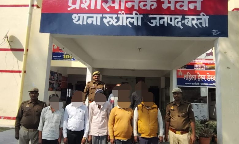बस्ती। पुलिस अधीक्षक बस्ती अभिनंदन सिंह द्वारा अपराध एवं अपराधियों के विरुद्ध चलाए जा रहे अभियान के तहत अपर पुलिस अधीक्षक बस्ती ओमप्रकाश सिंह के कुशल निर्देशन में तथा क्षेत्राधिकारी रूधौली स्वर्णिमा सिंह के निकट पर्यवेक्षण में प्रभारी निरीक्षक रूधौली विजय कुमार के नेतृत्व में रूधौली पुलिस टीम द्वारा शांति व्यवस्था के दृष्टिगत संज्ञेय अपराध घटित होने कि प्रबल संभावना को देखते हुए अन्तर्गत धारा- 170,126,135 ठछैै के तहत अभियुक्तगण को गिरफ्तार कर नियमानुसार कार्यवाही करते हुए सम्बन्धित न्यायालय रवाना किया गया। .कमलेश चौधरी उर्फ पप्पू पुत्र रामजतन चौधरी उम्र 40 वर्ष ग्राम रतनपुरवा सुखराम शर्मा पुत्र श्यामलाल शर्मा उम्र 40 वर्ष ग्राम बहादुरपुर राघवेन्द्र चौधरी पुत्र रामजतन चौधरी उम्र 30 वर्ष ग्राम रतनपुरवा धर्मेंद्र चौधरी उर्फ मुन्ना चौधरी पुत्र रामजतन चौधरी उम्र करीब 31 वर्ष ग्राम रातनुरवानागेंद्र चौधरी पुत्र नेबुलाल चौधरी उम्र 40 वर्ष ग्राम रतनपुरवा महेंद्र चौधरी पुत्र नेबुलाल चौधरी उम्र 28 वर्ष ग्राम रतनपुरवानेबुलाल चौधरी पुत्र रामहित उम्र 62 वर्ष ग्राम रतनपुरवा।