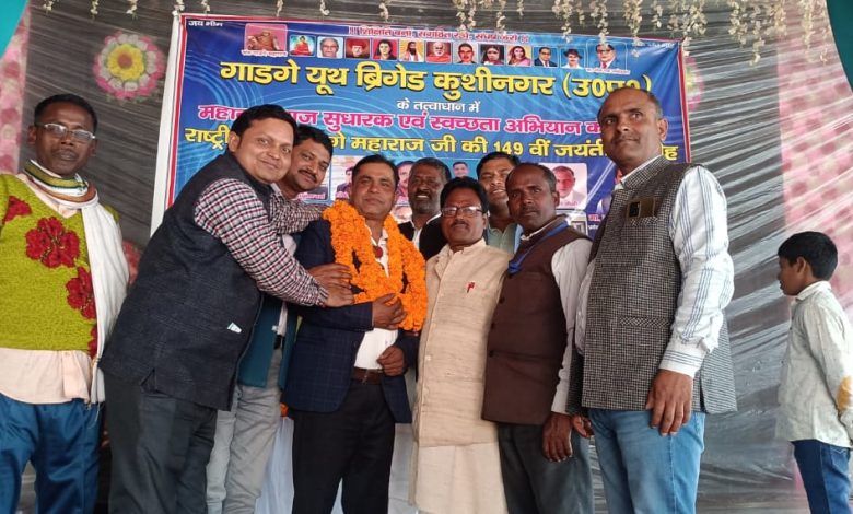 कुशीनगर। गाडगे यूथ बिग्रेड जिला कुशीनगर के अंतर्गत स्वच्छता के जनक राष्ट्र संत गाडगे की 149 वी जयंती व विचार गोष्ठी धौरहरा स्थित स्वयंवर लान में कार्यक्रम आयोजित कर मनाया गया जहा वक्ताओं ने कार्यक्रम में उपस्थित लोगो से राष्ट्र संत गाडगे से सीख लेने के साथ ही अपने बच्चों को उच्च शिक्षा देने की अपील किया । तथा सारे भेद भाव मिटाकर एक जुटता पर बल दिया। संत शिरोमणी के जयंती के अवसर पर मरीजों में दवा का वितरण भी किया गया।गाडगे यूथ ब्रिगेड कुशीनगर द्वारा आयोजित कार्यक्रम का उद्घाटन मुख्य अतिथि केंद्रीय विद्यालय के अवकाश प्राप्त प्रधानाचार्य अंबिका प्रसाद द्वारा राष्ट्र संत गाडगे के चित्र पर दीप प्रज्वलन कर व माल्यार्पण कर किया गया।अपने संबोधन में मुख्य अतिथि अंबिका प्रसाद ने कहा कि जब तक समाज शिक्षित नहीं होगा तब तक विकास संभव नहीं है इस लिए आप सभी लोग अपने बच्चों को शिक्षित करें।उन्होंने कहा की हमे संत गाडगे महाराज से सीख लेनी चाहिए ।उन्होंने समाज के साथ साथ कमजोर वर्ग के लोगो से भी अपील किए ।जिससे वह लोग भी अपने उत्थान के लिए शिक्षित बने। कार्यक्रम को संबोधित करते हुए विशिष्ट अतिथि दिनेश चौधरी ने कहा कि शिक्षा से ही समाज व कमजोर वर्ग का उत्थान संभव है इस लिए हमे शिक्षा के प्रति सजग होकर अपने बच्चो को शिक्षा दे। जब तक समाज का हर व्यक्ति शिक्षित नहीं होगा तब तक समाज का उत्थान नही होगा। कार्यक्रम को महेश रजक, छेदी प्रसाद,एड रमेश प्रसाद वर्मा,प्रमोद कुमार चौधरी ,अनिल निर्मल ,जवाहर गौतम ,नागेंद्र चौधरी, शारदा प्रसाद, बलराम चौधरी ने भी संबोधित किए।संचालन एडवोकेट सतेंद्र चौधरी ने किया।कार्यक्रम के आयोजक/ जिलाध्यक्ष रमेश प्रसाद कन्नौजिया व टीम द्वारा कार्यक्रम में उपस्थित सभी अतिथियों का माल्यार्पण कर स्वागत किया गया।इस दौरान रविंद्र प्रसाद ,अच्छेलाल कन्नौजिया,दिलीप चौधरी, नीरज कुमार कन्नौजिया,अनुज चौधरी,आनंद चौधरी,सुरेंद्र चौधरी,हरिकेश चौधरी, डा०एन के वर्मा,मनोज चौधरी ,चंद्रिका प्रसाद,राजेश चौधरी सहित हजारों की संख्या में लोग उपस्थित रहे।