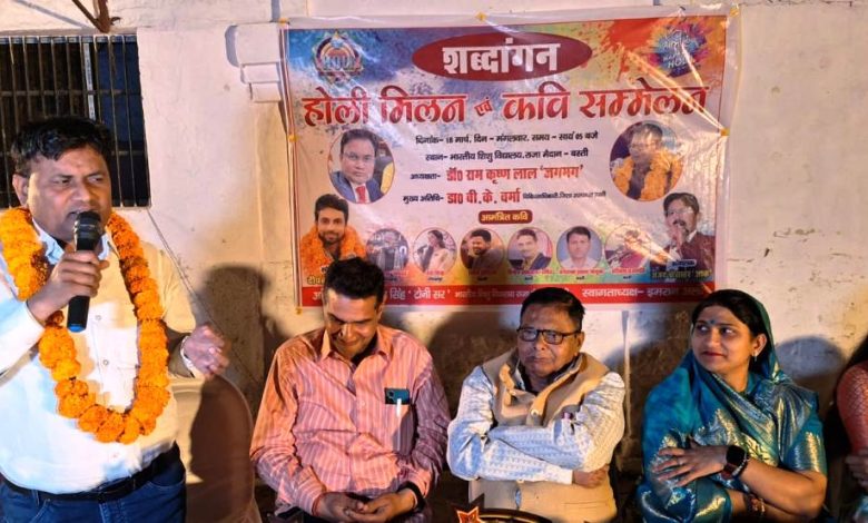 बस्ती। साहित्यिक संस्था शव्दांगन द्वारा होली के उपलक्ष्य में दीपक सिंह ‘प्रेमी’ के संयोजन में भारतीय शिशु विद्यालय राजा मैदान के परिसर में कवि सम्मेलन का आयोजन किया गया। मुख्य अतिथि डा. वी.के. वर्मा ने कहा कि होली पर्व का रचना संसार से बड़ा निकट का रिश्ता है। फाग और जोगीरा परम्परा का आरम्भ और विकास रचनाकारों के माध्यम से हो रहा है। अध्यक्षता करते हुये वरिष्ठ कवि डा. रामकृष्ण लाल ‘जगमग’ ने कहा कि होली पर भारतीय साहित्य में कविताओं की सुदीर्घ परम्परा है। संचालन अजय श्रीवास्तव अश्क ने किया। श्रुति त्रिपाठी द्वारा प्रस्तुत सरस्वती वंदना से आरम्भ कवि सम्मेलन में डा. रामकृष्ण लाल ‘जगमग’ ने कुछ यूं कहा‘ होली के दिन भंग पी, झूम रहे घनश्याम, राधा से कहने लगे, अम्मा तुम्हें प्रणाम’। डा. वी.के. वर्मा की पंक्तियां‘ एक प्रेमिका के संग, खेल रहा था रंग, तब तक पत्नी आ गयी, हुआ रंग में भंग, पर ठहाके लगे। विनोद उपाध्याय हर्षित की रचना‘ प्यार की हर कड़ी समझते हैं, कृष्ण की बासुरी समझते हैं’ को सराहा गया। नेहा मिश्रा की कविता- दे दिया सर्वस्व अपना कितना बेबश बाप होगा, कह रहे हाथों के कंगन, भाग्य पर अभिशाप होगा’ के द्वारा विसंगतियों को स्वर दिया। दीपक सिंह ‘प्रेमी’ ने कुछ यूं कहा- रंग तुझको लगाने की जिद है मेरी, मांग तेरी सजाने की जिद है मेरी’ को श्रोताआंें ने सराहा। कवि सम्मेलन में विवेक कौटिल्य, हरिकेश प्रजापति, जगदम्बा प्रसाद ‘भावुक’ गौरव त्रिपाठी आदि की रचनायें सराही गई। रोली सिंह ने होली की परम्परा पर प्रकाश डाला। इस अवसर पर आशुतोष सिंह टोनी इमरान अली, आनन्द, राजेश कुमार, विजयनाथ तिवारी, विपिन कुमार, दिनेश यादव, वृजेश कुमार,विपिन, डा. प्रमोद के साथ ही बड़ी संख्या में श्रोता उपस्थित रहे।