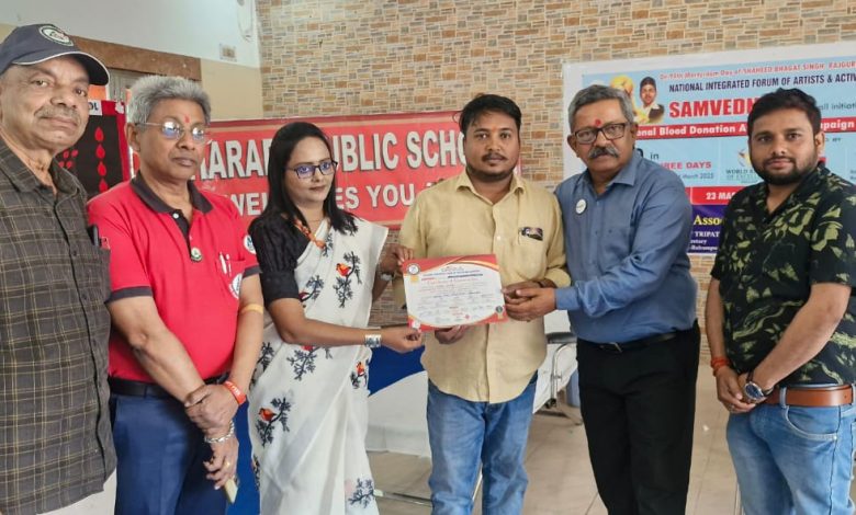 बलरामपुर। 6 बार गिनीज़ बुक ऑफ़ वर्ड रिकॉर्ड प्राप्त कर चुकी सामाजिक संस्था नेशनल इंटीग्रेटेड फोरम ऑफ़ आर्टिस्ट्स एन्ड एक्टिविस्ट्स (निफा) एवं यूथ हॉस्टल्स एसोसिएशन ऑफ़ इंडिया इकाई बलरामपुर के संयुक्त तत्वावधान में जनपद के प्रतिष्ठित शारदा पब्लिक स्कूल में बलिदानी भगत सिंह, राजगुरु एवं सुखदेव के 94 वें बलिदान दिवस पर एक वृहद स्वैच्छिक रक्तदान शिविर का आयोजन किया गया। शिविर में रक्तदानियों ने बढ़ चढ़ कर प्रतिभाग किया। सामाजिक संस्था निफा द्वारा संवेदना-2 अभियान के तहत पूरे विश्व में 2400 शिविर के माध्यम से डेढ़ लाख यूनिट रक्त एकत्र करने का लक्ष्य रखा गया है। इसी अभियान के तहत जनपद में भी रक्तदान शिविर का आयोजन किया गया, जिससे जरूरतमंदो और गंभीर रोग से पीड़ित मरीजों को समय पर रक्त उपलब्ध कराया जा सके। मुख्य चिकित्साधिकारी डॉ मुकेश कुमार रस्तोगी ने शिविर का शुभारंभ किया। शिविर में जनपद के ब्लडमैन आलोक अग्रवाल ने 34वॉं रक्तदान किया, वहीं डॉ अजय कुमार शुक्ला (अतिरिक्त मुख्य चिकित्साधिकारी), हिमांशु मणि दीक्षित ने 54वॉं, वैभव त्रिपाठी ने 40वॉं, अविनाश पांडे ने 35वॉं, विवेक श्रीवास्तव ने 27वॉं, तुलसीश दूबे ने 22वॉं, अनुज अग्रवाल ने 19वॉं, कुमार पीयूष ने 18वॉं, पंकज उपाध्याय ने 15वॉं व रवि कुमार गुप्ता ने 9वां रक्तदान किया। अन्य रक्तदान करने वालों में नारीशक्ति से अंशिका अग्रवाल, गौरी अग्रवाल, अनन्या रॉय, अंजली, महिमा, शीला एवं सोमा सहित अन्य में पराग बोस, श्रीकृष्णा बोस, विनीत सिंह, मनीष सिंह, नवीन सिंह, अक्षय शुक्ला, विनोद चौहान, साकेत तुलस्यान, गुरुअंश सिंह आदि सभी रक्तदानियों को निफा की तरफ से स्वन्त्रता सेनानियों के परिजनों के द्वारा हस्ताक्षरित विशेष प्रमाणपत्र देकर सम्मानित किया गया। शिविर में जनपद के अध्यापकों का विशेष सहयोग प्राप्त हुआ। कुल 92 रजिस्ट्रेशन के सापेक्ष 66 यूनिट रक्तदान हुआ, कुछ को स्वास्थ्य कारणों से इस महान कार्य से वंचित रहना पड़ गया।निफा के संवेदना-2 अभियान के उत्तर प्रदेश स्टेट प्रोजेक्ट डायरेक्टर ब्लडमैन आलोक अग्रवाल ने बताया कि निफा द्वारा बलिदान दिवस के उपलक्ष्य में प्रत्येक वर्ष रक्तदान शिविर का आयोजन किया जाता है इसी क्रम में इस वर्ष भी 23 मार्च बलिदान दिवस को रक्तदान शिविर का आयोजन अंतर्राष्ट्रीय स्तर पर किया जा रहा है। निफा बलरामपुर के जिला कोआर्डिनेटर संदीप उपाध्याय ने कहा कि रक्तदान के संबध में अभी भी बहुत सारी भ्रांतियां व्याप्त हैं, इन्हें दूर करने के लिए समाज के प्रबुद्ध वर्ग को आगे आने की जरूरत है। निफा के जिला सचिव वैभव त्रिपाठी ने अपना 40वाँ रक्तदान करने के बाद कहा कि इससे किसी भी प्रकार की कमजोरी नहीं होती है बल्कि हम ज्यादा स्वस्थ रहते हैं। श