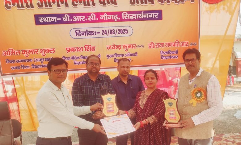 सिद्धार्थनगर। तीन से छ वर्ष आयु के बच्चों को बाल वाटिका अर्थात प्री प्रायमरी स्कूल से जोड़कर ही बुनियादी शिक्षा को गुणवत्तापूर्ण एवं प्रभावी बनाया जा सकता है। बीआरसी नौगढ़ में आयोजित जनपद स्तरीय हमारा आंगन हमारे बच्चे कार्यक्रम में यह विचार बीईओ इटवा महेंद्र कुमार ने बतौर मुख्य अतिथि व्यक्त किए। उन्होंने ने कहा कि छोटे बच्चों को विद्यालय के प्रति आकर्षित करने के लिए विद्यालय को बच्चों की रूचि के अनुरूप आकर्षक एवं बाल केंद्रित होना चाहिए। विद्यालय में बच्चों को अपने घर आंगन जैसा ही सहज वातावरण बनाना हर शिक्षक एवं आंगनबाड़ी कार्यकत्री का दायित्व है। एसआरजी अंशुमान सिंह के कुशल संचालन में संपन्न कार्यक्रम को बीईओ सदर धर्मेन्द्र कुमार पाल, ज़िला समन्वयक डीपी श्रीवास्तव, करूणापति त्रिपाठी,अमित शुक्ला, संदीप कुमार, कार्तिकेय पांडेय, अपूर्व कुमार श्रीवास्तव, डाक्टर विनयकांत मिश्रा, पशुपति दुबे एवं कल्पना आदि ने भी संबोधित किया। विभिन्न स्कूलों के बच्चों ने सुंदर सांस्कृतिक कार्यक्रम प्रस्तुत किए। जनपद में बालवाटिका, प्री प्रायमरी स्तर पर उत्कृष्ट शैक्षणिक योगदान हेतु किरन उपाध्याय, नियाज अहमद, साधना श्रीवास्तव, इफ्तिखारुन्निसा, राम सुभग, जमील अहमद, सुमन त्रिपाठी, शमसुलहक, सत्येन्द्र गुप्ता, प्रार्थना मिश्रा, हर्षिता पटारिया तथा शबाना बेगम आदि शिक्षकों एवं आंगनबाड़ी कार्यकत्रियों को स्मृति चिन्ह् एवं प्रशस्ति पत्र प्रदान कर सम्मानित किया गया।