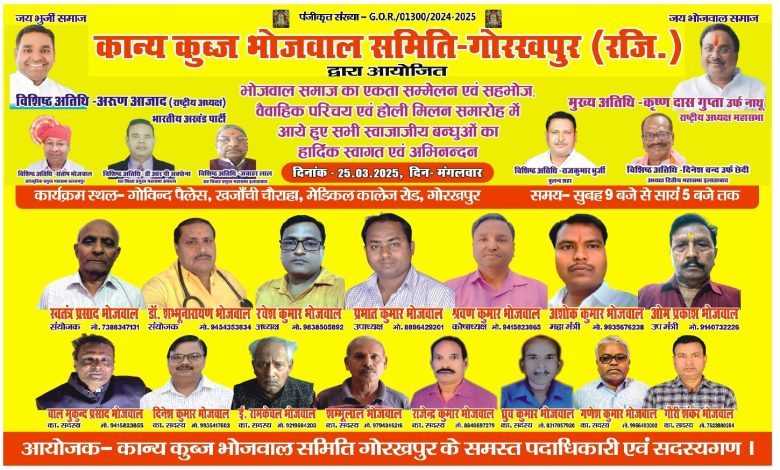 कुशीनगर। भोजवाल समाज के आदरणीय सबके अजीज, नवजवानों के प्रेरणा श्रोत लोक प्रिय श्री कृष्ण दास गुप्ता नाथू भोजवाल जी राष्ट्रीय अध्यक्ष गोरखपुर मे हो रहे कार्यक्रम के मुख्य अतिथि व आदरणीय श्री दिनेश कुमार गुप्ता उर्फ छेदी भोजवाल द्वितीय अध्यक्ष महासभा विशिष्ट अतिथि प्रथम एवम् श्री जवाहरलाल गुप्ता भोजवाल सामूहिक विवाह प्रमुख श्री अखिल भारतीय कान्यकुब्ज वैश्य महासभा विशिष्ट अथिति। लखनऊ से आदरणीय श्री अरुण आजाद जी भोजवाल भारतीय अखंड पार्टी के राष्ट्रीय अध्यक्ष गोरखपुर कार्यकर्म के मुख्य विशिष्ट अतिथि, बुलंदशहर से माननीय श्री राज कुमार भोजवाल जी विशिष्ट अतिथि, विशिष्ट अथिति माननीय श्री सन्तोष कुमार गुप्ता भोजवाल जी बलरामपुर, श्री रामजी भोजवाल प्रयागराज (मुम्बई)व श्री राजेश कुमार भोजवाल जी अमेठी, शिक्षा प्रमुख महासभा डॉक्टर आर पी सक्सेना भोजवाल अंबाला सिटी पंजाब एवम् अनेक गणमान सम्मानित महोदय का आगमन गोरखपुर की धरती पर 25 मार्च 2025 दिन मंगलवार दिन में 9 बजे गोविन्द पैलेस खजांची चौराहा गोरखपुर में होना सुनिश्चित है। भोजवाल समाज के वरिष्ठ लोगों ने अपने समाज से अपील किया कि अधिक से अधिक संख्या में पहुंच कर कार्यक्रम को सफल बनायें व एकता एवम् भाईचारा का मिशाल कायम करे। जिसमें मुख्य उद्देश्य होली मिलन समारोह, बैबाहिक परिचय व शहभोज का कार्यक्रम किया गया है। अंतः भोजवाल समाज के सभी बंधुओं को समय से पहुँचने की अपील किया गया है।