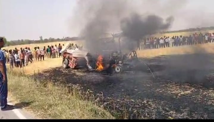 गर्मी का कहर ट्रैक्टर जल कर खाक, वाल वाल बची गेहूँ की फसलें
