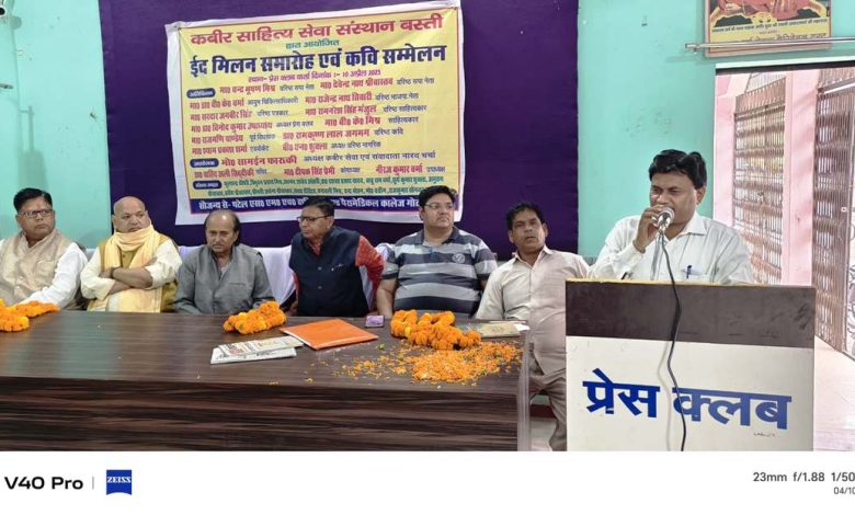 बस्ती। कबीर साहित्य सेवा संस्थान के अध्यक्ष मो. सामईन फारूकी के संयोजन में गुरूवार को प्रेस क्लब में ईद मिलन समारोह का आयोजन किया गया। मुख्य अतिथि समाजवादी पार्टी के वरिष्ठ नेता चन्द्रभूषण मिश्र ने कहा कि पर्व त्यौहार हमें नयी ऊर्जा देते हैं। ईद खुशियों का पर्व है जिसे सभी लोग मिल जुलकर मनाते हैं। इससे गंगा जमुनी तहजीब को मजबूती मिलती है। विशिष्ट अतिथि देवेन्द्रनाथ श्रीवास्तव ने कहा कि समय बदल गया है, लोग पर्व त्यौहारों का बटवारा करने लगे हैं। ऐसे में हमें परस्पर भाई चारे को मजबूत बनाने के लिये अपनी साझा संस्कृति को स्वर देना होगा। वरिष्ठ चिकित्सक डा. वी.के. वर्मा ने कहा, “हमारा देश गंगा-जमुनी तहजीब का प्रतीक है, यहां हर त्योहार मिलजुल कर मनाया जाता है, यही हमारी ताकत है, यही हमारी पहचान है.” कहा कि यह आयोजन भाईचारे और सौहार्द का उत्सव है। ईद मिलन समारोेह को श्याम प्रकाश शर्मा, नीरज कुमार वर्मा, सन्तोष श्रीवास्तव आदि ने सम्बोधित किया। वरिष्ठ साहित्यकार डॉ. रामकृष्ण लाल जगमग ने अध्यक्षता करते हुये कहा कि हमें अपने भाई चारे को बनाये बचाये रखना होगा। संचालन डा. अफजल हुसेन अफजल ने किया। कबीर साहित्य सेवा संस्थान के अध्यक्ष मो. सामईन फारूकी ने आगन्तुकों का स्वागत करते हुये कहा कि ईद खुशियां बाटने का त्यौहार है। इस मौके कवि सतीश आर्य, डा. विनोद कुमार उपायाय, दीपक सिंह प्रेमी, शाद अहमद शाद, रहमान अली ‘रहमान’ अहमद जावेद अंसारी, अजीत श्रीवास्तव, सागर गोरखपुरी, अर्चना श्रीवास्तव, फूलचन्द चौधरी आदि ने कविता और शायरी के माध्यम से ईद की खुशियों को साझा किया। कार्यक्रम में महेन्द्र सिंह, आशुतोष, राम विलास कसौधन, जगत प्रसाद आदि उपस्थित रहे।