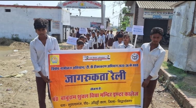 बढ़नी/सिद्धार्थनगर। विकास खण्ड बढ़नी के तुलसियापुर चौराहे पर स्थित पं0 बाबूराम शुक्ल विद्या मन्दिर इन्टर कालेज में छात्र-छात्राओं के द्वारा शनिवार को विश्व टीकाकरण सप्ताह के दौरान विशेष टीकाकरण व विशेष नामांकन अभियान के तहत जागरुकता रैली निकाली गई। इस दौरान यह जागरूकता रैली विद्यालय से शुरू होकर छात्र-छात्राओं द्वारा नारों के माध्यम से लोगों को जागरूक करते हुए पुनः विद्यालय पर आकर समाप्त हो गई। इस दौरान प्रधानाचार्य रवि शुक्ल ने कहा कि 24 अप्रैल से 10 मई तक ष्विश्व टीकाकरण सप्ताहष् के दौरान विशेष टीकाकरण सत्रों का आयोजन एवं स्कूल आधारित टी0डी0 टीकाकरण अभियान चलाया जा रहा है। जिसमें डिप्थीरिया (गलाघोटू) एवं टी0डी0 (धनुषटंकार) रोग के बचाव हेतु टी0डी0 का टीका लगाया जायेगा, जो पूरी तरह से सुरक्षित है। इसके अलावा विशेष नामांकन अभियान के तहत कक्षा 6 व 9 में बच्चों को विद्यालय में नामांकन करवाने के लिए गांवों में घर-घर जाकर लोगों को जागरूक करना है। इस दौरान आशाराम यादव, धन्नजय पाठक, अजय यादव, जितेन्द्र शुक्ल, रामनरेश यादव, संत प्रसाद, सुमेरु गिरी, सीतू गुप्ता, सुनैना सिंह, शिवानी, रीना व रंजना आदि मौजूद रहें।