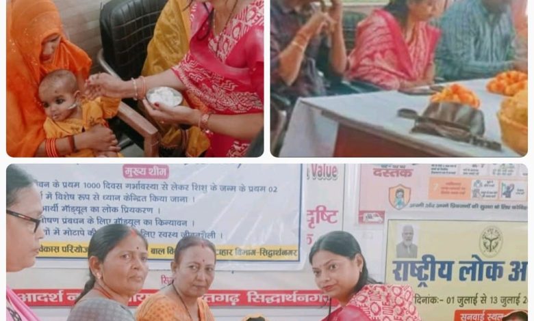 शोहरतगढ़़/सिद्धार्थनगर। नगर पंचायत शोहरतगढ़़ अध्यक्षा उमा अग्रवाल की अध्यक्षता में सोमवार को पोषण पखवाड़ा का आयोजन नपा0 सभागार में सम्पन्न हुआ। इस अवसर पर चेयरमैन उमा अग्रवाल ने पोषण पखवाड़ा के शुभारम्भ के अवसर पर सभी को बधाई दी। चेयरमैन उमा अग्रवाल ने सभी आंगनबाड़ी कार्यकत्रियों को निर्देश दिया कि प्रत्येक बुधवार व शनिवार को बीएचएनडी दिवस का आयोजन होगा, जिसमें अधिक से अधिक गर्भवती महिलाओं की जांच/चिन्हांकन, पोषाहार का वितरण, गोदभराई आदि करायें। उक्त 02 दिवस अपरिहार्य स्थिति में ही छुट्टी लें। गर्भवती महिलाओ को एक दिन पहले सूचित करें। सभी लोग मिलक आकांक्षी जनपद को कुपोषण मुक्त कराकर अग्रणी जनपद की श्रेणी में लाने के लिए कार्य करें। सभी बच्चों एवं गर्भवती महिलाओ का शत-प्रतिषत टीकाकरण करायें। सरकार द्वारा पोषण पखवाड़ा के माध्यम से धात्री महिलाओ, गर्भवती महिलाओं व बच्चों को पोषाहार का वितरण की उनको कुपोषण से मुक्त कराया जायेगा। पोषण पखवाड़ा के अवसर पर गर्भवती महिलाओं की गोदभराई एवं अन्नप्रासन्न भी कराया गया। पोषण पखवाड़ा शपथ दिलाया गया। इस दौरान चेयरमैन प्रतिनिधि रवि अग्रवाल, बाल विकास परियोजना के कर्मचारी, आंगनबाड़ी कार्यकत्री सहित अन्य लोग मौजूद रहें।