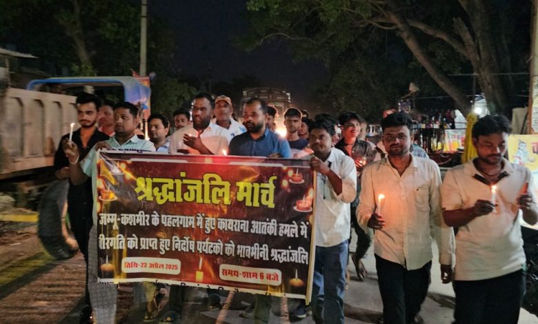 भनवापुर। डुमरियागंज तहसील क्षेत्र के मन्नीजोत चौराहे पर में जम्मू कश्मीर के पहलगाम में आतंकी हमले में मारे गए लोगों को भाजपा कार्यकर्ताओं वा क्षेत्रीय युवाओं ने कैंडल मार्च निकालकर श्रद्धांजलि अर्पित की। मन्नीजोत चौराहे पर कैंडल मार्च निकालकर मारे गए लोगों को श्रद्धांजलि देते हुए 2 मिनट का मौन भी रखा गया। इस दौरान प्रधान संघ के भनवापुर ब्लॉक अध्यक्ष लालजी शुक्ला ने कहा कि अब आतंकवाद खात्मे के तरफ बढ़ रहा है हमारी सरकार किसी भी हाल में आतंकवादियों को बख्शने वाली नहीं है। वहीं पेडरियाजीत में बलेसर यादव रामसेवक राजभर व ग्राम प्रधान नरेंद्र दूवे की अगुवाई में आतंकवादियों का पुतला फूंका गया और आतंकवादियों व पाकिस्तान को सबक सिखाओ के नारे लगाए,हिंदू या वाहिनी तत्वावधान में कैंडल मार्च निकाला गया इटवा रामलीला मैदान से शिव शक्ति मंदिर पर समापन किया गया। इस दौरान शत्रुघ्न मिश्रा, संजय मिश्रा,शिव बहादुर वर्मा,अमन मिश्रा,राहुल, हनुमंत यादव,शिवबालक चौरसिया, बलराम चौरसिया, ईश्वरदीन पाण्डेय,संजय मिश्र,राम कृपाल चौधरी,विवेक श्रीवास्तव, अशोक कुमार पाण्डेय,विन्दराज गिरि, कप्तान सिंह,राम शब्द उपाध्याय, छोटू चौहान, विनोद सोनी,मयाराम भारती,पंकज कुमार पाण्डेय, शिव कुमार वर्मा, सुमित्रानंदन श्रीवास्तव,रामदेव बाबा,मनोज विश्वकर्मा,गोपाल पाण्डेय, रंजीत यादव, विजलू मौर्य, महेश चौहान, दुर्गा प्रजापति,वृजेश पाठक, सुबाश यादव,मदन यादव विश्राम यादव, रामबली चौधरी,विनोद सोनी,राम नरेश यादव रामकुमार चौधरी, रामशब्द उपाध्याय,वृजेश मौर्य,हजारी प्रसाद गुप्ता,मयाराम भारती आदि लोग मौजूद रहे।