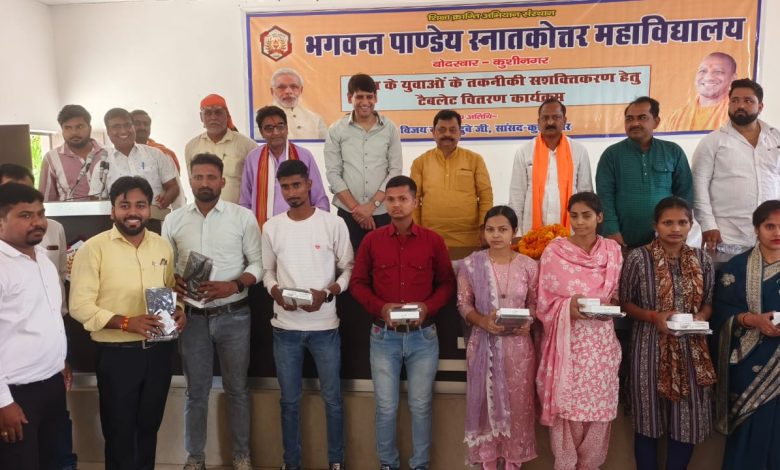 बोदरवार। भाजपा सरकार शिक्षा पर विशेष ध्यान देने के साथ डिजिटल इंडिया के सपनों को साकार कर रही हैं तकनीकी शिक्षा में किसी तरह की कोई समस्या न हो इसके लिए सरकार सभी को टेबलेट वितरण कर रही हैं इसके माध्यम से छात्र छात्राओं को इंटरनेट के माध्यम से ऑनलाइन जानकारी मिल सके और स्मार्ट टेबलेट के वितरण से छात्रों को आसान होगा ऑनलाइन क़ी पढ़ाई। उक्त बाते आज कुशीनगर सांसद विजय कुमार दुबे भगवंत पाण्डेय स्नातकोत्तर महाविद्यालय बोदरवार के सभागार में बतौर मुख्य अतिथि संबोधित किया और आगे कहा कि इस योजना के तहत युवाओं को तकनीकी सशक्तिकरण हेतु टैबलेट वितरण कार्यक्रम में महाविद्यालय के 373 छात्र व छात्राओं को टैबलेट वितरण किया गया उन्होंने कहा कि आज भाजपा सरकार गुणवत्तापूर्ण शिक्षा के साथ ही पारदर्शी व शुचितापूर्ण परीक्षा से छात्र-छात्राओं के जीवन को नया आयाम देने हेतु डबल इंजन की सरकार पूर्ण प्रतिबद्ध है। प्रबन्धक अखिलेश पाण्डेय ने कहा कि शिक्षा के माध्यम विद्यार्थियों का विकास होता है। टैबलेट वितरण से छात्र छात्राएं सरकार के डिजिटल इंडिया की दिशा में बढ़ते कदम के अपनी भागदारी सुनिश्चित करेंगे।कार्यक्रम का संचालन प्रधानाचार्य डॉ सुनील पाण्डेय ने किया। कार्यक्रम की शुरुआत दीप प्रज्वलन कर सरस्वती देवी प्रतिमा पर पुष्प अर्पित कर किया गया। इसके बाद प्रबंधक अखिलेश पाण्डेय ने अतिथियों को अंग वस्त्र और स्मृति चिन्ह भेंट कर उनका स्वागत किया गया। उक्त अवसर पर भाजपा के घनश्याम गोरखपुरी, जिलाध्यक्ष अनुसूचित मोर्चा रविन्द्र प्रसाद, पूर्व मण्डल अध्यक्ष राजेश जी गुप्त,मण्डल अध्यक्ष विचित्र मणि पाण्डेय, कप्तागंज मण्डल अध्यक्ष आनन्द मिश्रा, रामानुज मिश्रा,सांसद मीडिया प्रभारी निखिल उपाध्याय, विशाल सिंह, , वीरेन्द्र गुप्ता, राजेश साहनी, सुभाष सिंह,शुभम उपाध्याय, अनिल सिंह, अवधेश गिरी, गौरव तिवारी, मोनू कन्नौजिया, प्राचार्य अवध किशोर पाण्डेय, पुंडरीक मिश्रा, विपिन बिहारी पाण्डेय, सेक्टर संयोजक टी. एन. गुप्ता व पदाधिकारी सहित शिक्षक गण सहित छात्र व छात्राएं उपस्थित रहे।