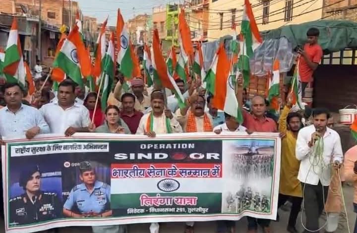 तुलसीपुर। तुलसीपुर नगर पंचायत में आज ऑपरेशन सिंदूर की सफलता पर भाजपा क्षेत्रीय विधायक कैलाशनाथ शुक्ला की अगुआई में तिरंगा यात्रा निकाली गई।तिरंगा यात्रा हनुमानगढ़ी मंदिर से कलश चौराहे भाजपा कार्यालय तक पदयात्रा निकाली गई।तिरंगा यात्रा में शामिल लोग अपने हाथ में तिरंगा लिए चल रहे थे।जुलूस में भारतीय सेना की महिला सैनिक कर्नल सोफिया कुरैशी,व्योमिका सिंह के जिंदाबाद व भारत माता की जय के गगनभेदी नारों से नगर गुंजायमान रहा।तिरंगा यात्रा में पूर्व जिला अध्यक्ष प्रदीप सिंह महामंत्री विष्णु देव गुप्ता मंडल अध्यक्ष विश्राम सिंह महंत राम गुप्ता अनिल लाठ शेरावाली शुक्ला राम जी आर्य ओम प्रकाश चौरसिया बनारसी लाल मोदनवाल प्रेम मित्तल अनूप गुप्ता राजू संतोष अवन चरन अनूप श्रीवास्तव विजय प्रताप सोनी रामदयाल सोनी शकील राईनी विवेक मोदनवाल शिवकुमार गुप्ता सहित सैकड़ों नगर वासी उपस्थित रहे।