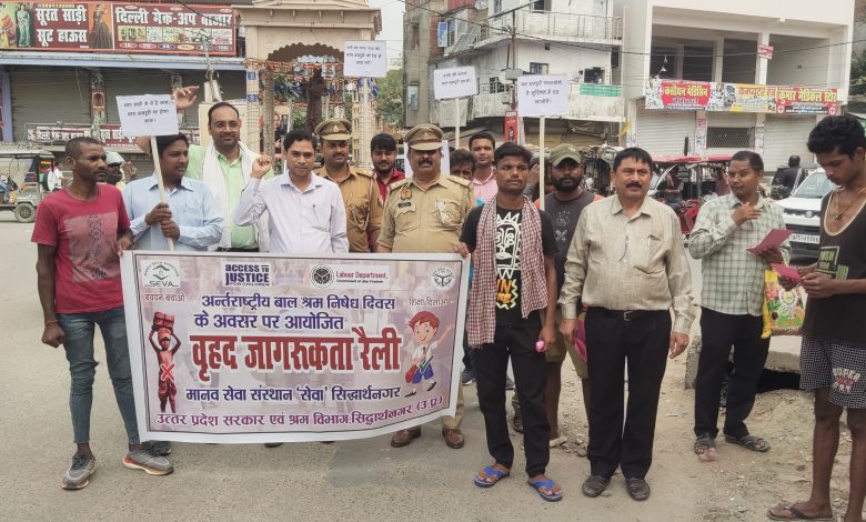 सिद्धार्थनगर। अंतरराष्ट्रीय बाल श्रम निषेध दिवस के अवसर पर गुरुवार को सिद्धार्थनगर मुख्यालय पर श्रम विभाग, एएचटीयू पुलिस एवं मानव सेवा संस्थान सेवा के संयुक्त तत्वाधान में वृहद जागरूकता रैली निकाल कर लोगों को बाल श्रम न कराये जाने हेतु जागरूक किया गया। जागरूकता रैली नगर पालिका कार्यलय से निकाली गई जिसमें बाल श्रम पर प्रतिबंध लगाओ, बच्चों का जीवन बचाओ। हम सब ने यह ठाना है, बाल मजदूरी को देश से मिटाना है। चाहे कितनी भी हो मजबूरी, बच्चों से ना कराए मजदूरी। बाल श्रम हटाओ, बच्चों का बचपन बचाओ। बाल मजदूरी करवाओगे, तो मुश्किल में पड़ जाओगे। बच्चों से मजदूरी कराओगे, तो जीवन में कभी सुख नहीं पाओगे। गांव-गांव शहर-शहर अब एक ही नारा, बच्चों को मजदूरी से बचाओ और बनो उनका सहारा। बच्चों को पढ़ाओ, बाल मजदूरी हटाओ। बच्चों बनाओ बाल मजदूरी से दूरी, वरना जिंदगी रह जाएगी अधूरी। बच्चे है देश की शान, मत बेचो इन्हें मजदूरी के हाथ। नारे लगाए जा रहे थे। रैली सिद्धार्थ तिराहा, रेलवे स्टेशन पहुँची, तत्पश्चात पुनः नगर पालिका कार्यालय पहुँची, जँहा पर रैली का समापन हुआ। इस अवसर पर श्रम पर्वतन अधिकारी उज्ज्वल त्रिपाठी ने बालश्रम करवाने वाले नियोक्ता के खिलाफ लगने वाली धाराओं के सम्बन्ध में विस्तृत जानकारी दी। इस दौरान एएचटीयू प्रभारी निरीक्षक राम कृपाल शुक्ला ने बाल अधिकारो, एवं बाल श्रम जैसी समस्याओं के बारे वविस्तृत जानकारी दी तथा पॉक्सो ऐक्ट एवं जेजे ऐक्ट की जानकारी दी। मानव सेवा संस्थान सेवा के जिला समन्वयक जय प्रकाश गुप्ता ने बालश्रम, बाल तस्करी, बंधुआ मजदूर, बाल विवाह एवं बाल यौन उत्पीड़न से बचाव हेतु विस्तृत जानकारी साझा किया। इस दौरान उप निरीक्षक हरिओम, संतोष कुमार सिंह, लक्ष्मन सिंह, मुख्य आरक्षी देवेंद्र यादव, आरक्षी आशुतोष सिंह, समरजीत चौरसिया, महिला आरक्षी इशरावती, ममता, श्रम विभाग के गौरी दत्त तिवारी, शैलेंद्र वर्मा, राहुल शर्मा, अमरजीत पाण्डेय, राघव प्रसाद, जगदम्बा प्रसाद, आनन्द कुमार, मानव सेवा संस्थान सेवा के आनन्द, संदीप कुमार मद्धेशिया, पिरामल फाउंडेशन के डिस्ट्रिक प्रोग्राम लीड सत्येंद्र सिंह, नीति आयोग के डीपीए अभिवनव द्विवेदी सहित भारी संख्या में लोग शामिल रहे।