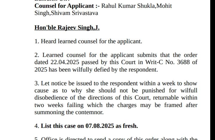उपरोक्त नियम का संज्ञान लेते हुए आपको उपरोक्त अपव्यय की गयी धनराशि के सापेक्ष कारण बताओ नोटिस प्रदान करते हुए निर्देशित किया जाता है कि एक पक्ष के भीतर अपना स्पष्टीकरण साक्ष्यों सहित अधोहस्ताक्षरी को उपलब्ध करना सुनिश्चित करें। अन्यथा की दशा में उक्त धारा में निहित प्राविधानों का उपयोग करते हुए अग्रेतर कार्यवाही की जायेगी। ऐसा आदेश (मोनिका रानी) जिला मजिस्ट्रेट, बहराइच द्वारा ग्राम प्रधान पटना को कारण बताओं नोटिस जारी किया गया लेकिन 22.4.2025 को इलाहाबाद हाई कोर्ट की लखनऊ बेंच ने अपने दिए गये आदेश में 2 महीने के अंदर जिला अधिकारी बहराइच से रिपोर्ट मांगा था | 2 महीना बीतने के बाद जब कोई भी कार्रवाई की रिपोर्ट कोर्ट को नहीं दी गयी तो याची ने पुनः हाई कोर्ट में कोर्ट के आदेश की अवहेलना करने के संबंध में याचिका दायर किया और दायर किए गए याचिका में कहा गया कि जिला अधिकारी बहराइच के द्वारा हाई कोर्ट के आदेशों का उल्लंघन किया गया और हाई कोर्ट के आर्डर को मान्य नहीं किया गया | जिस कारण से याची को समय से न्याय नहीं मिल पा रहा है बार-बार वह कोर्ट की शरण में जा रहा है लेकिन कोर्ट के आदेशों का उल्लंघन और ना मानना जिला अधिकारी के द्वारा किया जा रहा है | इस संबंध में विद्वान न्यायाधीश ने याचिका को स्वीकार करते हुए जिलाधिकारी बहराइच को कड़ी फटकार लगाते हुए अपना पक्ष प्रस्तुत करने के लिए बाकायदा नोटिस जारी किया |