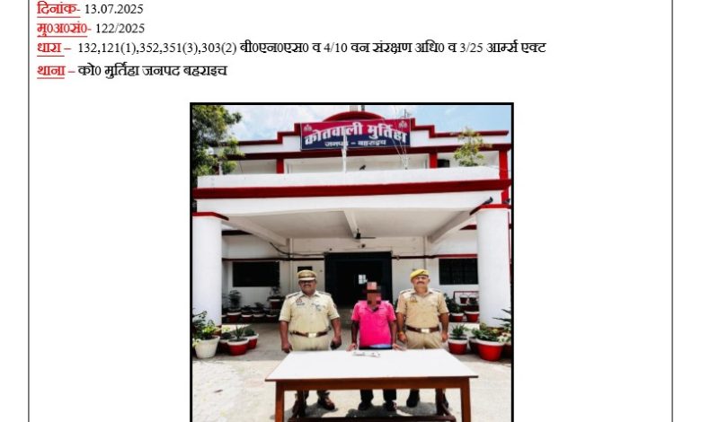 बहराइच। थाना कोतवाली मूर्तिहा प्रभारी निरीक्षक रामनरेश के कुशल नेतृत्व में गठित पुलिस टीम द्वारा दिनांक 13.07.2025 को मु0अ0सं0 122/2025 धारा 132, 121(1), 352, 351(3), 303(2) बी0एन0एस0 व 4/10 वन संरक्षण अधि0 व 3/25 आर्म्स एक्ट से संबंधित अभि0 सोबरन पुत्र शान्ति प्रसाद निवासी प्रतापपुर जंगल मटेरा थाना को0 मुर्तिहा जनपद बहराइच को मुखबिर खास की सूचना पर समय 6.20 बजे हिरासत में लेकर किरदार करके जेल भेज दिया गया। गिरफ्तार किए गए उपयुक्त के पास से 01 तमंचा .12 बोर, 02 जिन्दा कारतूस बरामद किया गया।