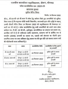 स्नातक की तृतीय मेरिट लिस्ट जारी,काउंसिलिंग 22 सितम्बर से। ओबरा नगर के राजकीय स्नातकोत्तर महाविद्यालय ओबरा में बीए,बीएससी,बीकॉम प्रथम वर्ष में प्रवेश हेतु आवेदन किये हुए अभ्यर्थियों की तीसरी मेरिट लिस्ट महात्मा गांधी काशी विद्यापीठ वाराणसी द्वारा सीट वृद्धि के पश्चात 19 सितम्बर 2022 को महाविद्यालय की वेबसाइट पर जारी कर दी गयी।उक्त आशय की जानकारी देते हुए महाविद्यालय के प्राचार्य प्रोफेसर डॉ प्रमोद कुमार ने बताया कि बीएससी प्रथम वर्ष के तृतीय मेरिट लिस्ट के समस्त अभ्यर्थियों काउंसिलिंग 22 सितम्बर 2022 को,बीकॉम प्रथम वर्ष के तृतीय मेरिट लिस्ट के समस्त अभ्यर्थियों कि काउंसिलिंग 23 सितम्बर 2022 को एवं बीए प्रथम वर्ष के तृतीय मेरिट लिस्ट के समस्त अभ्यर्थियों कि काउंसिलिंग दिनांक 24 सितम्बर 2022 को दोपहर 12 बजे से अपराहन 4 बजे तक महाविद्यालय परिसर में सम्पन्न होगी।प्रवेश काउंसिलिंग हेतु सभी अभ्यर्थियों को अपने साथ प्रवेशआवेदनपत्र,टीसी,सीसी,हाईस्कूल,इंटर मीडिएट का अंक पत्र प्रमाणपत्र,आरक्षित वर्ग से है तो जाति प्रमाण पत्र,आर्थिक रूप से कमजोर अभ्यर्थी इडब्लूएस प्रमाण पत्र,एक या दो वर्ष का अंतराल होने पर नोटरी द्वारा प्रमाणित शपथ पत्र सहित सभी प्रमाण पत्रों की मूल प्रति एवं छाया प्रति लाना अनिवार्य है।
