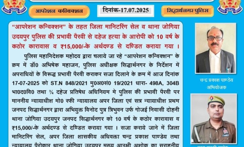 सिद्धार्थनगर। पुलिस महानिदेशक महोदय द्वारा चलाये जा रहे “आपरेशन कन्विक्शन” के क्रम में पुलिस अधीक्षक सिद्धार्थनगर डॉ0 अभिषेक महाजन के निर्देशन में अपराधियों के विरूद्ध प्रभावी पैरवी कराकर सजा दिलाने के क्रम में गुरुवार को ैज्.छ 848/2021 मु0अ0सं0 19/2021 धारा-498।, 304ठ भा0द0वि0 तथा = दहेज प्रतिषेध अधिनियम मे पुलिस की प्रभावी पैरवी पर मा0 न्यायाधीश मो0 रफी न्यायालय अपर जिला एवं सत्र न्यायाधीश प्रथम जनपद सिद्धार्थनगर द्वारा अभियुक्त विनोद पुत्र त्रिभुवन उर्फ गोजई निवासी दोहनी थाना जोगिया उदयपुर जनपद सिद्धार्थनगर को 10 वर्ष के कठोर कारावास व ₹15,000/-के अर्थदण्ड से दण्डित कराया गया। सजा कराये जाने में जिला मानिटरिंग सेल, अपर जिला शासकीय अधिवक्ता चन्द्रप्रकाश पाण्डेय तथा न्यायालय पैरोकार थाना जोगिया उदयपुर मुख्य आरक्षी अशोक का सराहनीय योगदान रहा।