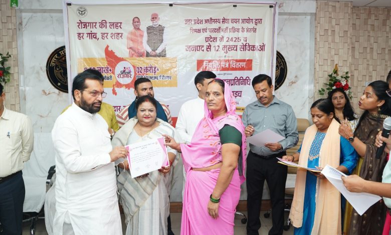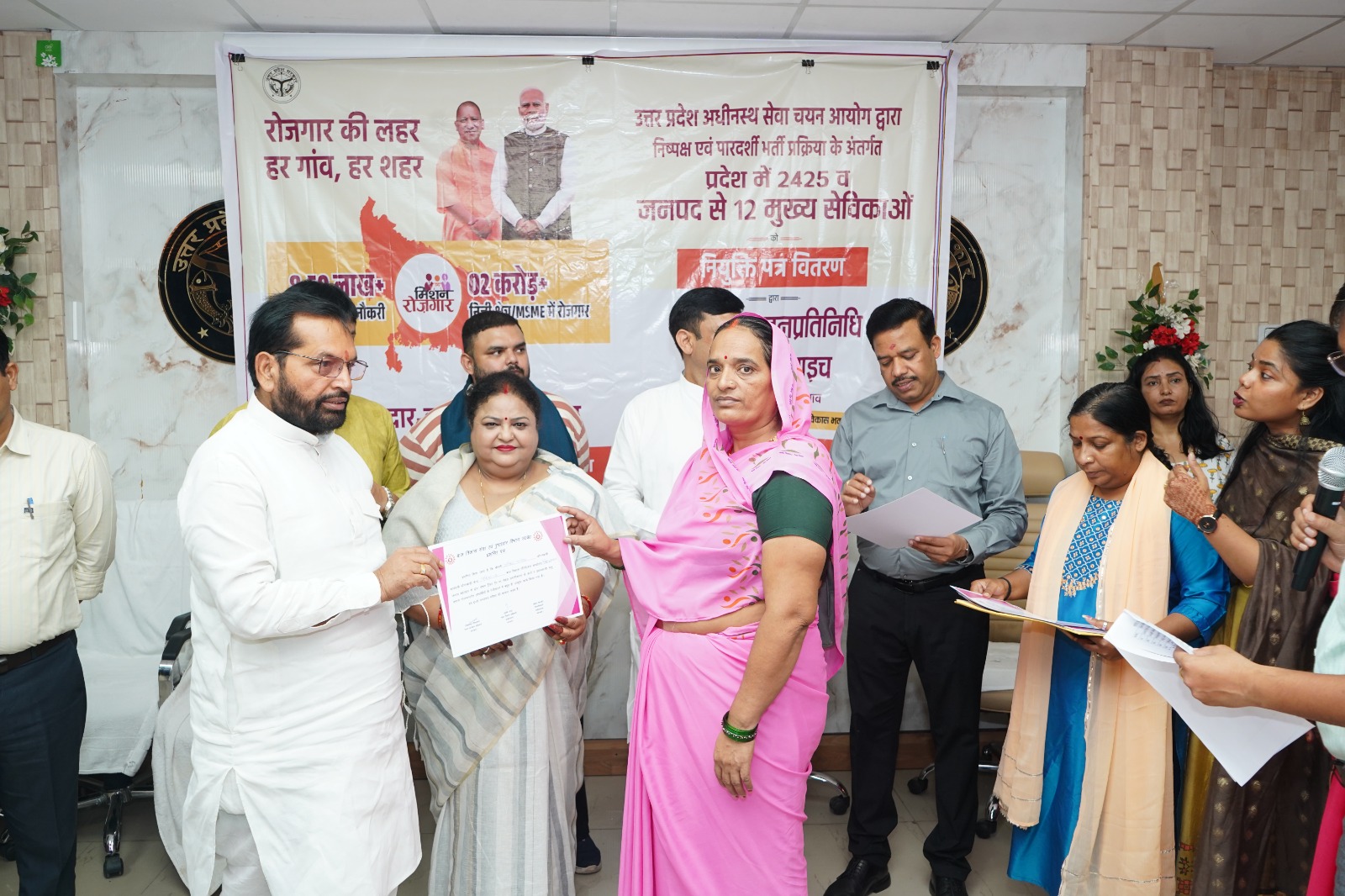 बहराइच । उत्तर प्रदेश अधीनस्थ सेवा चयन आयोग द्वारा निष्पक्ष एवं पारदर्शी भर्ती प्रक्रिया के अंतर्गत प्रदेश के चयनित 2,425 मुख्य सेविकाओं एवं 13 फार्मासिस्टों को नियुक्ति पत्र वितरण हेतु लोक भवन सभागार लखनऊ में आयोजित समारोह में मुख्यमंत्री योगी आदित्यनाथ द्वारा चयनित अभ्यर्थियों को नियुक्ति पत्र वितरण किया गया। इस अवसर पर सांसद बहराइच डॉ. आनन्द कुमार गोंड, एमएलसी पदमसेन चौधरी व डॉ. प्रज्ञा त्रिपाठी, विधायक पयागपुर सुभाष त्रिपाठी, सदर अनुपमा जयसवाल, सांसद कैसरगंज करण भूषण सिंह के प्रतिनिधि सुनील सिंह ने मुख्य विकास अधिकारी मुकेश चन्द्र के साथ जिले के चयनित 12 मुख्य सेविकाओं को नियुक्ति पत्र का वितरण किया। लोकभवन सभागार में आयोजित समारोह का सजीव प्रसारण भी किया गया।