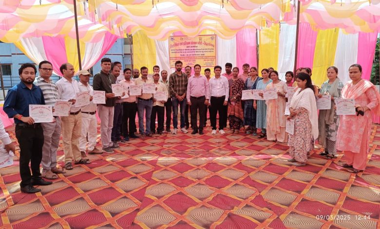 बांसी/सिद्धार्थनगर। जिला शिक्षा एवं प्रशिक्षण संस्थान बांसी सिद्धार्थ नगर में उप शिक्षा निदेशक/प्राचार्य उमेश कुमार त्रिपाठी के कुशल मार्गदर्शन एवं वरिष्ठ प्रवक्ता लालजी कुमार पाण्डेय के नेतृत्व में दो दिवसीय जनपद स्तरीय नवाचार महोत्सव /मेला का सकुशल समापन हुआ। इस महोत्सव मे सभी ब्लॉकों से बेसिक शिक्षक, राजकीय माध्यमिक विद्यालयों के शिक्षक व एआरपी ने प्रतिभाग किया, कार्यक्रम के नोडल श्रवण कुमार ने बताया इस कार्यक्रम के उपरांत नॉलेज शेयरिंग का कार्यक्रम ब्लॉक स्तर पर किया जाएगा। इस दौरान वरिष्ठ प्रवक्ता लालजी कुमार पांडे शिक्षकों के द्वारा प्रस्तुत नवाचार /बेस्ट प्रैक्टिसेज को मूल्यांकन समिति के साथ बारीकी से निरीक्षण गया। नवाचार मेले के दूसरे दिन सहायक शिक्षा निदेशक संजय कुमार शुक्ल व जिला बेसिक शिक्षा अधिकारी शैलेश कुमार ने भी शिक्षकों के नवाचारों व टीएलएम का निरीक्षण किया। इसके बाद सभी प्रतिभागियों को प्रमाण पत्र देकर सम्मानित किया गया स इस दौरान डायट प्रवक्ता मंजुला यादव, मोहम्मद यूनुस, धर्मेंद्र कुमार ,सतीश कुमार धवन, अनुराग कुमार श्रीवास्तव, डॉ. प्रतिभा सिंह,अंजना, महेंद्र यादव, अनिल कुमार बिंद, फ़ुरकान अहमद, पंकज कुमार और बद्री नाथ त्रिपाठी उपस्थित रहे।