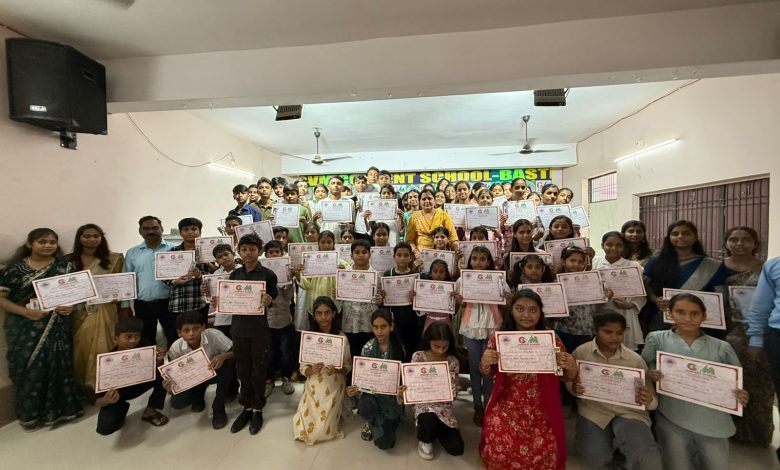 बस्ती। शिक्षक दिवस की पूर्व संध्या पर जी वी एम कान्वेंट स्कूल के परिसर में ‘शिष्य शिक्षक दिवस‘ मनाया गया जिसमें बड़ी संख्या में बच्चों ने प्रतिभाग किया बच्चे शिक्षकों के वेशभूषा में विद्यालय में आकर शिक्षकों की भूमिका में शिक्षण कार्य किया इससे उनके प्रतिभा में बहुमुखी विकास होता है और उन्हें शिक्षण की बारीकियां सीखने को मिलती है विद्यालय की प्रधानाचार्य विजयलक्ष्मी सिंह ने बच्चों के शिक्षण कार्य का निरीक्षण किया और शिक्षण की बारीकियों के बारे में बताया शिक्षक दिवस में प्रतिभाग करने वाले बच्चों में आकृति, वर्षा,वर्तिका,गौरी, समृद्धि, सदिया, अरनव सर्वज्ञ,आर्यन, अवंतिका, अविष्का अंशिका आराध्या सबीहा, सात्विक शिवम,श्रेयांश, शिक्षा, शुभम, युविका,साल्वी काशिफ, ओम,अनंत पावनी,आयुष,अंश राजश्री, वंशिका,हर्ष सक्षम, श्रेया, सिमरन ज्योति,निधि शगुफ्ता अदिति मुख्य रहे। बाद में विद्यालय की प्रधानाचार्य विजयलक्ष्मी सिंह ने प्रतिभागी बच्चों को प्रमाण पत्र एवं उपहार देकर सम्मानित किया इस अवसर पर राकेश, राजेश, निगहत, गिरीश,पवन सावित्री, दिवाकर,जितेंद्र दीपेंद्र, अश्वनी, समेत आदि शिक्षक एवं शिक्षिकाएं उपस्थित रहे
