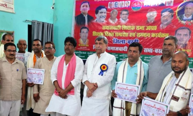 बस्ती। समाजवादी शिक्षक सभा द्वारा प्रेस क्लब सभागार में डा. सुरेन्द्र प्रसाद चौधरी की अध्यक्षता में शिक्षक दिवस के अवसर पर प्रदेश नेतृत्व के दिशा निर्देश के अनुरूप शिक्षकों को उनके योगदान के लिये समाजवादी शिक्षक रत्न सम्मान से सम्मानित किया गया। मुख्य अतिथि सांसद राम प्रसाद चौधरी ने कहा कि व्यक्ति के जीवन में माता-पिता के बाद शिक्षक का स्थान सर्वाेच्च है। सपा जिलाध्यक्ष एवं बस्ती सदर विधायक महेन्द्रनाथ यादव, विधायक राजेन्द्र चौधरी, पूर्व विधायक राजमणि पाण्डेय, सपा नेता दयाशंकर मिश्र ने सम्मानित किये गये शिक्षकों का उत्साहवर्धन करते हुये कहा कि शिक्षक के मस्तिष्क में सृजन और प्रलय दोनोें पलते हैं। अच्छा हो कि प्रदेश सरकार शिक्षकों, शिक्षा मित्रों, अनुदेशकों की समस्याओं का प्रभावी निस्तारण कराये जिससे पूर्व राष्ट्रपति डा. सर्वपल्ली राधा कृष्णन ने शिक्षको के लिये जो भावना व्यक्त किया था वह जमीनी धरातल पर साकार हो। डा. सुरेन्द्र प्रसाद चौधरी ने अतिथियों, शिक्षकों का स्वागत करते हुये बताया कि विजय प्रकाश प्रजापति, सुनील कुमार मौर्य, धर्मेन्द्र कुमार निषाद, इरफान अहमद, डा. त्रिलोकी नाथ, प्रभुनाथ पाण्डेय, दुर्गेश यादव, रूद्रनाथ सिंह को उनके शैक्षणिक योगदान के लिये समाजवादी शिक्षक रत्न सम्मान से सम्मानित किया गया। संचालन महामंत्री श्रीनाथ विश्वकर्मा ने किया। कार्यक्रम में मुख्य रूप से डॉ. प्रमोद उपाध्याय, डॉ. वीरेन्द्र उपाध्याय, डॉ. अरून मिश्र, डॉ. बेचन यादव, डॉ. राजकिशोर वर्मा, डॉ. फूलदेव यादव, बी.एन. तिवारी, चक्रधर मौर्य, रमेश चन्द्र गौतम, तफज्जुल हुसेन, पवन चौधरी, रामभवन यादव, डॉ. सिद्धार्थ, डॉ. अजय यादव, दरवेश यादव, हरीराम, हरीश, दिनेश यादव के साथ ही बड़ी संख्या में शिक्षक और समाजवादी विचारधारा से जुड़े लोग मौजूद रहे।