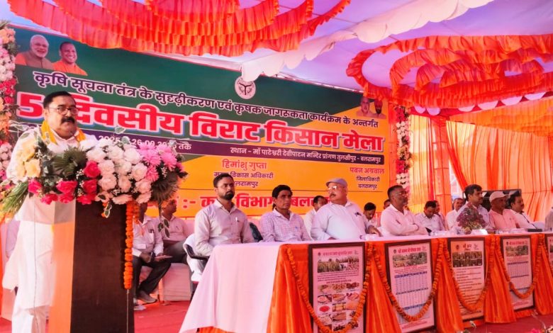 बलरामपुर। तुलसीपुर के देवीपाटन प्रांगण में चल रहे कृषि सूचना तंत्र के सुदृढ़ीकरण, कृषक जागरूकता एवं विराट किसान मेला कार्यक्रम के तीसरे दिन किसानों को सरकार की योजनाओं की जानकारी दी गई। वही संवाद के माध्यम से किसानों की समस्याओं और समाधान पर चर्चा की गई।कार्यक्रम के मुख्य अतिथि भाजपा के पूर्व जिलाध्यक्ष प्रदीप सिंह ने कहा कि कृषक ही हमारे देश के लिए रीढ़ है, उनकी उन्नत ही राष्ट्र की समृद्धि है। केंद्र सरकार कृषक के लिए कई योजनाएं चल रही है। जिससे किसानों की आय दोगुनी हो सके। उन्होंने कहा कि किसानों को नई तकनीक के बारे में जागरूक होना चाहिए। खेती किसानी में नई तकनीक एक क्रांतिकारी का कार्य कर रही है। कार्यक्रम में संवाद के माध्यम से किसानों की समस्याओं एवं समाधान पर चर्चा किया गया। इस अवसर पर उप कृषि निदेशक श्याम नारायण राम,वरिष्ठ वैज्ञानिक ज्ञटज्ञ बलरामपुर गिरिजेश जायसवाल,वरिष्ठ वैज्ञानिक ज्ञटज्ञ बलरामपुर डॉ. जगवीर सिंह, जिला कृषि सलाहकार डॉ. ए. के. एम त्रिपाठी, अजय कुमार सिंह,अधिशासी अभियंता विद्युत विभाग, बलरामपुर अनिल कुमार, पशु चिकित्साधिकारी बलरामपुरडॉ. प्रेमचन्द्र,सहायक अभियंता सिंचाई विभाग नरेश कुमार, पूर्व मंडल अध्यक्ष बृज गोपाल पांडे, कृषि सहायक तकनीकी प्रबंधक संतोष तिवारी, कृषि सहायक तकनीकी प्रबंधक राजेश वर्मा, गन्ना डायरेक्टर माधव प्रसाद चौधरी जी व अन्य गणमान्य लोग उपस्थित रहे।