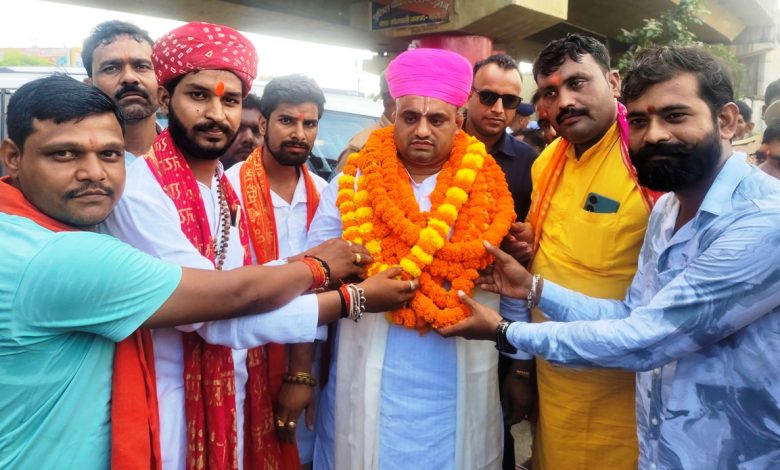 पुजारी हेमन्त दास महाराज का फूल मालाओं के साथ स्वागत