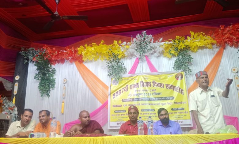 सिद्धार्थनगर। जनपद सिद्धार्थनगर के विकासखंड जोगिया उदयपुर के अंतर्गत ग्राम पंचायत जोगिया संगम मैरिज हाल में 2287 धर्म विजय दिवस समारोह धूमधाम के साथ मनाया गया जिसकी आयोजन शाक्य मुकेश कुमार मौर्य परम पूज्य बनते अलार्म वर्मी बौद्ध विहार सिद्धार्थ नगर एवं विशिष्ट डॉक्टर राजहंस कुशवाहा वरिष्ठ सहायक प्रधानाचार्य रतन सिंह डिग्री कॉलेज जनपद सिद्धार्थनगर मुख्य प्रवक्ता शाक्य राम नारायण मोर या एवं कार्यक्रम की अध्यक्षता कर रहे पूर्व कानून को संभोग प्रसाद की मौजूदगी में कार्यक्रम का शुभारंभ किया गया और लोगों ने अपने-अपने विचार व्यक्त करते हुए कहा कि पहले भी बौद्ध धर्म को लोग मानते थे और उसी के उपलक्ष्य कालिंग में लड़ाई होने से सम्राट अशोक भीषण रक्तपात को देखकर बौद्ध धर्म को ग्रहण कर लिया और उन्होंने यह संकल्प लिया कि अब अहिंसा और शांति का मार्ग अपना कर बौद्ध धर्म को आगे बढ़ने का काम करेंगे इसी दिन के अवसर पर धर्म विजय दिवस के रूप में मनाया जाता है वह आज उसी के उपलक्ष में जोगिया उदयपुर में संगम मैरिज हॉल में मुकेश कुमार मौर्य के नेतृत्व में सम्राट अशोक धाम में विजय दिवस समारोह का आयोजन किया गया जिसमें शिवनारायण बौद्ध मनोज पासवान अविनाश कुमार आजाद रामशरण मौर्य साधु शरण रमेश कुमार पृथ्वीराज लोधी आदि कई लोग मौजूद रहे।