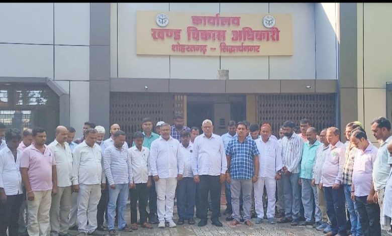 शोहरतगढ़/सिद्धार्थनगर। विकास खण्ड शोहरतगढ़ अन्तर्गत ग्राम पंचायत रमवापुर खास के 39 वर्षीय रोजगार सेवक स्व0 कुलदीप गिरि का सोमवार को अकस्मिक निधन हो गया। उनके मृत्यु की सूचना मिलते ही परीजनों, ग्रामवासियों सहित ग्राम प्रधानों में शोक की लहर दौड़ गयी। रोजगार सेवक की मृत्यु के उपरान्त बुधवार को विकास खण्ड परिसर में जिलाध्यक्ष डा0 पवन मिश्रा एवं ब्लाक अध्यक्ष विजय कुमार दूबे की अगुवाई में ग्राम प्रधानों, रोजगार सेवकों एवं विकास खण्ड कर्मियों द्वारा शोकसभा का आयोजन कर मृत आत्मा की शान्ति के लिए दो मिनट का मौन व्रत रखा गया। इस दौरान जिलाध्यक्ष डा0 पवन मिश्रा, ब्लाक अध्यक्ष शोहरतगढ़़ जफर आलम, ब्लाक प्रमुख प्रतिनिधि अमित यादव, खण्ड विकास अधिकारी चन्द्रभूषण त्रिपाठी, एपीओ, राकेश गौड़, अनिल, नितिन श्रीवास्तव, पियूष मिश्रा, पशुपति चौधरी, अजय भारतीया, राम सिंह, राम स्वरुप गुप्ता, कामेश्वर मिश्रा, गौरव श्रीवास्तव, संदीप सरोज, विक्रम यादव, सिकन्दर यादव, शिवलाल, अजय चौहान, शिवशंकर चौधरी, मनीष वर्मा, विजय कुमार दूबे, राजेन्द्र शुक्ला, सूर्य प्रकाश, सुनील गुप्ता, विरेन्द्र यादव, राजाराम, अम्बिका प्रसाद, राजदेव, अमर सहाय, राकेश चौधरी, सुग्रीव यादव सहित तमाम ग्राम प्रधान व कर्मचारी मौजूद रहे।