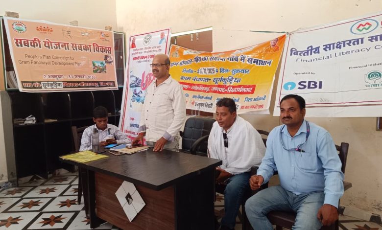 शोहरतगढ़/सिद्धार्थनगर। शुक्रवार को शोहरतगढ़ विकास खण्ड के ग्राम पंचायत सूर्यकुड़िया में गाँव की समस्या गाँव में समाधान करने हेतु चौपाल कार्यक्रम का आयोजन किया गया। चौपाल कार्यक्रम की अध्यक्षता करते हुए सचिव रामस्वरुप गुप्ता ने केंद्र और प्रदेश सरकार द्वारा चलाई जा रही ब्लॉक स्तरीय योजनाओं की विस्तृत जानकारी दी। साथ ही कार्यक्रम को सम्बोधित करते हुए आर.बी.आई. बैंक प्रतिनिधि संतोष शुक्ला नें मुख्यमंत्री युवा उद्यमी योजना, मुख्यमंत्री सड़क दुर्घटना योजना, जीवन ज्योति योजना, अटल पेंशन योजना, सुकन्या संबृद्धि योजना, मुख्यमंत्री कन्या सुमंगला योजना, मुख्यमंत्री सामूहिक विवाह योजना, गरीब व्यक्तियों के पुत्रियों की शादी अनुदान योजना, वृद्धावस्था पेंशन योजनाओं के साथ आर्थिक उन्नति, बैंकिंग बीमा और साइबर क्राइम के रोकथाम आदि को लेकर लोगों को जागरूक किया।चौपाल कार्यक्रम में मुख्य रूप से राशनकार्ड, फैमिली आईडी, वृद्धावस्था, विधवा पेंशन व दिव्यांग पेंशन, आयुष्मान कार्ड, पीएम आवास योजना, मनरेगा योजना, किसान सम्मान निधि, व्यक्तिगत शौचालय, मुख्यमंत्री युवा उद्यमी योजना, मुख्यमंत्री सड़क दुर्घटना योजना, जीवन ज्योति योजना, अटल पेंशन योजना आदि योजनाओं पर विस्तार से प्रकाश डाला गया। साथ ही शासन द्वारा चलायी जा रही गरीब कल्याण व अन्य लाभकारी योजनाओं के बारें में जानकारी देते हुए सचिव ने ग्रामीणों को स्वच्छता के प्रति जागरूक किया। इस दौरान प्रमुख रूप से ग्राम प्रधान संगीता, प्रधान प्रतिनिधि घनश्याम, रोजगार सेवक सूर्य प्रकाश, पंचायत सहायक नेहा यादव, सफाई कर्मी बलराम चौधरी, दिनेश कुमार, अब्दुल कादिर, कोटेदार अनिल के साथ गाँव के फूलमती, अनीता, मैनुद्दीन, हौसिल, राजेंद्र साहनी, राम अचल चौधरी, गया साहनी, रामकिशोर, बैतूल्लाह आदि मौजूद रहे।