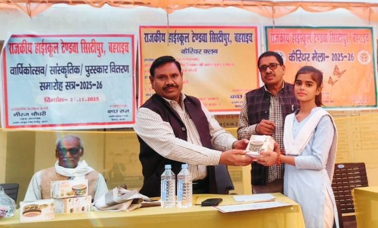 बहराइच। राजकीय हाईस्कूल टेण्डवा सिस्टीपुर में कैरियर गाइडेंस मेला, खेलकूद प्रतियोगिता ,सांस्कृतिक कार्यक्रम, पुरा छात्र सम्मेलन , शिक्षक -अभिभावक सम्मेलन ,वार्षिकोत्सव एवं पुरस्कार वितरण कार्यक्रम के अंतर्गत विविध कार्यक्रमों का संचालन करते हुए शुक्रवार को सांस्कृतिक कार्यक्रम, वार्षिकोत्सव एवं पुरस्कार वितरण का आयोजन किया गया। जिसमें खेलकूद में उत्कृष्ट स्थान प्राप्त करने वाले छात्र-छात्राओं को प्रमाण – पत्र एवं पुरस्कार प्रदान किया गया। कैरियर गाइडेंस कार्यक्रमों के माध्यम से छात्र-छात्राओं ने भविष्य संवारने के लिए विविध मार्गाे का ज्ञान प्राप्त किया। वार्षिक समारोह एवं पुरस्कार वितरण बड़े ही हर्षाेल्लास और उत्साहपूर्ण वातावरण में आयोजित किया गया। कार्यक्रम का शुभारंभ मुख्य अतिथि यशवन्त सिंह प्रधानाचार्य गांधी इण्टर कालेज बहराइच ने दीप प्रज्वलित करके किया।त्रिद्विवसीय कार्यक्रम के माध्यम से प्रधानाचार्य बच्छराज ने छात्र-छात्राओं को विभिन्न कैरियर विकल्पों, शैक्षणिक क्षेत्रों, प्रतियोगी परीक्षाओं, तकनीकी एवं व्यावसायिक पाठ्यक्रमों के बारे में विस्तृत एवं उपयोगी जानकारी प्रदान की गई। बदलते समय की चुनौतियों के अनुरूप सही दिशा चुनने के महत्व पर विस्तार से प्रकाश डाला और छात्रों को अपनी रुचि एवं योग्यता के आधार पर लक्ष्य तय करने हेतु प्रेरित किया। छात्राओं को महिला सुरक्षा, कानूनी अधिकारों, तथा साइबर क्राइम से बचाव के महत्वपूर्ण पहलुओं पर जागरूक किया, जिसे सभी ने अत्यंत ध्यानपूर्वक सुना। कार्यक्रम की सफलता में विद्यार्थियों की उत्साही सहभागिता तथा शिक्षकों के प्रेरक मार्गदर्शन की महत्वपूर्ण भूमिका रही। विद्यालय परिवार ने सभी अतिथियों के प्रति आभार व्यक्त करते हुए भविष्य में भी ऐसे सार्थक एवं उपयोगी आयोजनों के प्रति अपनी प्रतिबद्धता दोहराई। यह कैरियर गाइडेंस मेला विद्यार्थियों के लिए अत्यंत प्रेरणादायी सिद्ध हुआ और उनके उज्ज्वल भविष्य की दिशा में एक महत्वपूर्ण कदम साबित हुआ। इस अवसर पर शिक्षक प्रमोद कुमार सिंह, शिव कुमार, प्रमोद कुमार, वीरेंद्र कुमार तिवारी सहित अन्य गणमान्य लोग उपस्थित रहे।