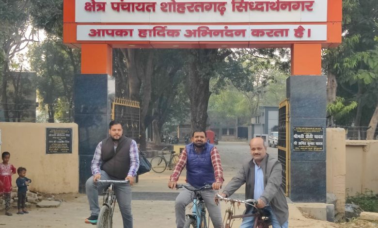 शोहरतगढ़ में सचिवों ने साइकिल चलाकर किया विरोध प्रदर्शन