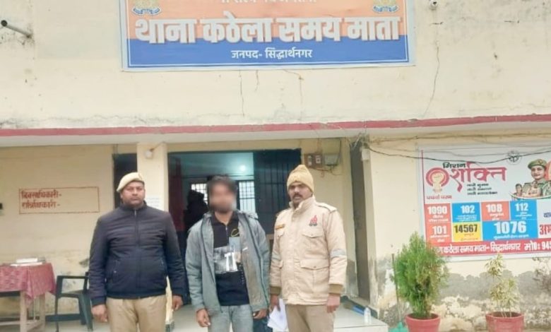 कठेला/सिद्धार्थनगर। थाना कठेला समय माता पुलिस ने थाना स्थानीय पर पंजीकृत मु0अ0सं0-148/25 धारा 137(2)/87/65(1) /352/351(3) बीएनएस व 5/6 पॉक्सो एक्ट से सम्बन्धित अभियुक्त इजहार पुत्र नूर मोहम्मद निवासी सौरहवा ग्रान्ट टोला धुन्नीजोत थाना कठेला समय माता जनपद सिद्धार्थनगर को पण्डित डीहवा मोड़ कठेला गर्वी से गिरफ्तार कर विधिक कार्यवाही कर माननीय न्यायालय भेजा गया। वहीं गिरफ्तार अभियुक्त इजहार पुत्र नूर मोहम्मद निवासी सौरहवा ग्रान्ट टोला धुन्नीजोत थाना कठेला समय माता जनपद सिद्धार्थनगर था। इस दौरान गिरफ्तारी करने वाली पुलिस टीम में उप निरीक्षक आनन्द कुमार, कांस्टेबल विनित शुक्ला, कांस्टेबल विशाल पासवान, कांस्टेबल अभय यादव उपस्थित रहें।