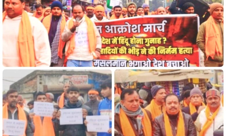 बढ़नी/सिद्धार्थनगर। बांग्लादेश में एक हिन्दू युवक दीपू चन्द्र की हत्या के विरोध में चेयरमैन सुनील अग्रहरि के नेतृत्व में विभिन्न हिन्दूवादी संगठनों के कार्यकर्ताओं ने मंगलवार को नगर पंचायत बढ़नी कस्बे में जन आक्रोश मार्च निकालकर विरोध जताया। लोगों ने बांग्लादेश सरकार एवं प्रधानमंत्री मो0 युनूस का पुतला फूंका और दोषियों के खिलाफ कार्रवाई की मांग की। उन्होंने कहा कि भारत शान्ति में विश्वास रखता है, लेकिन हिन्दुओं पर अत्याचार बर्दाश्त नहीं किया जायेगा। बांग्लादेश में एक सनातनी हिन्दू युवक की हत्या की घटना के विरोध में मंगलवार को चेयरमैन सुनील अग्रहरि के नेतृत्व में हिन्दूवादी कार्यकर्ताओं ने बढ़नी कस्बे में जन आक्रोश मार्च निकालकर विरोध जताया। जो कस्बे के स्टेशन रोड, राम जानकी मंदिर मार्ग, श्रीरामलीला मैदान, चट्टी बाजार, आर्य समाज रोड़, गोला बाजार होते हुए माल गोदाम तिराहे पर पहुंचकर एक सभा में तब्दील हो गया। जहां पर लोगों ने बांग्लादेश सरकार एवं प्रधानमंत्री मो0 युनुस का पुतला फूंका। कार्यकर्ताओं ने रोहिंग्या मुसलमान भगाओ, देश बचाओ, हिन्दुओं की हत्या बन्द करो, मो0 यूनुस मुर्दाबाद, बांग्लादेशी हिन्दुओं का नरसंहार बन्द करो, भारत में भाईचारा, बांग्लादेश में क्यों हिन्दू बेचारा आदि नारेबाजी करते हुए घटना की कड़ी निन्दा की और बांग्लादेश सरकार से दोषियों के खिलाफ सख्त कार्रवाई की मांग की। नगर पंचायत बढ़नी बाजार के चेयरमैन सुनील अग्रहरि ने कहा कि भारत शान्ति में विश्वास रखने वाला देश है, लेकिन निर्दाेष हिन्दुओं पर हो रहे अत्याचारों को किसी भी सूरत में बर्दाश्त नहीं किया जा सकता। उन्होंने अन्तर्राष्ट्रीय समुदाय से भी इस मामले में संज्ञान लेने की अपील की। वहीं पूर्व भाजयुमो जिलाध्यक्ष राजकुमार सिंह उर्फ राजू शाही ने कहा कि बांग्लादेश में जिहादी तत्वों द्वारा एक हिंदू युवक दीपू चन्द्र की पेड़ से लटकाकर की गर्द हत्या मानवता को शर्मसार करने वाली है। उन्होंने आरोप लगाया कि वहां की सरकार अपने नागरिकों की सुरक्षा सुनिश्चित करने में विफल साबित हो रही है। वरिष्ठ भाजपा नेता त्रियुगी नाथ अग्रहरि ने चेतावनी देते हुए कहा कि सनातन समाज अब चुप नहीं रहेगा और यदि ऐसी घटनाएं जारी रहीं तो विश्व स्तर पर इसके खिलाफ आवाज बुलन्द की जायेगी। पूर्व भाजपा मण्डल अध्यक्ष सिद्धार्थ शंकर पाठक ने कहा कि किसी भी सभ्य समाज में धर्म, जाति, पहचान आदि के आधार पर अत्याचार निन्दनीय है। बांग्लादेश में दीपू चन्द्र को उन लोगों ने धोखा दिया, जिनके साथ उसकी दोस्ती थी। इस दौरान गणेश अग्रहरि, सन्तोष आजमगढ़िया, अजय प्रताप यादव, ध्रुव चतुर्वेदी, अमित मौर्य, धीरेन्द्र प्रताप त्रिपाठी, प्रभात तिवारी, 