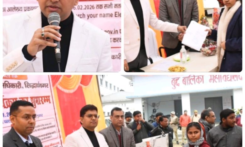 सिद्धार्थनगर। जिला निर्वाचन अधिकारी/जिलाधिकारी शिवशरणप्पा जीएन द्वारा मतदाता रजिस्ट्रेशन कार्यक्रम का शुभारम्भ बुद्ध बालिका महाविद्यालय गौतमपल्ली भीमापार सिद्धार्थनगर से किया गया। भारत निर्वाचन आयोग निर्वाचक नामावलियों का विशेष प्रगाढ़ पुनरीक्षण-2026 के अन्तर्गत दावे और आपत्तियां प्राप्त करने की अवधि 06.01.2026 से 06.02.2026 तक है। जिला निर्वाचन अधिकारी ने कहा कि सभी राजनैतिक दलों के प्रतिनिधियों को मतदाता सूची दिया गया है। सभी लोग सूची में अपना नाम देख सकते है। उसमें यदि कोई त्रुटि है, तो आपत्ति एवं दावे 06.02.2026 तक दिये जायेंगे, जिसका निस्तारण कराया जायेगा। अन्तिम प्रकाशन 06.03.2026 को कराया जायेगा। जिलाधिकारी ने उपस्थित बच्चों से कहा कि आप लोग फार्म-06 भरकर मतदाता सूची में अपना नाम दर्ज करा लें। यदि किसी को कोई समस्या हो तो सम्बन्धित बीएलओ से सम्पर्क कर सकते हैं अथवा तहसील से भी सम्पर्क कर सकते है। भारत निर्वाचन आयोग के निर्देशानुसार कार्य किया जा रहा है। वेबसाइट ूूू.बमवनजजंतचतंकमेी.दपब.पद बटन पर क्लिक करके मतदाताओं द्वारा अपने से सम्बन्धित विवरण की पुष्टि की जा सकती है। मतदाता ीजजचेरू//मसमबजवतंसेमंतबी.पद पर भी अपना नाम मतदाता सूची में देख सकते है। अपने मोबाइल में म्बपदमज ।चच टवजमत एवं भ्मसच स्पदम ।चच डाउनलोड करके भी उक्त सेवायें प्राप्त की जा सकती है। इस अवसर पर उपरोक्त के अतिरिक्त उपजिला निर्वाचन अधिकारी/अपर जिलाधिकारी (वि0/रा0) गौरव श्रीवास्तव, अपर जिलाधिकारी न्यायिक ज्ञानप्रकाश व अन्य सम्बन्धित अधिकारी आदि उपस्थित थे।