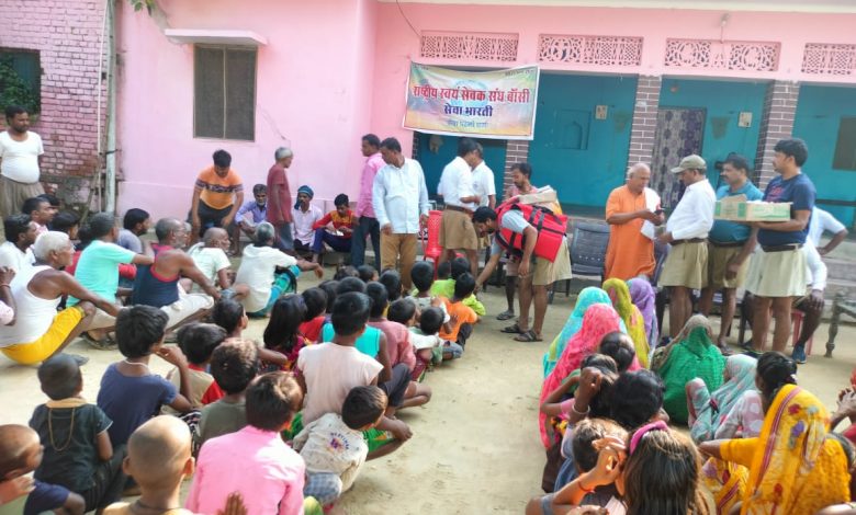 सिद्धार्थनगर : राष्ट्रीय स्वयं सेवक संघ ने बाढ़ पीड़ितों में बाटी राहत सामग्री