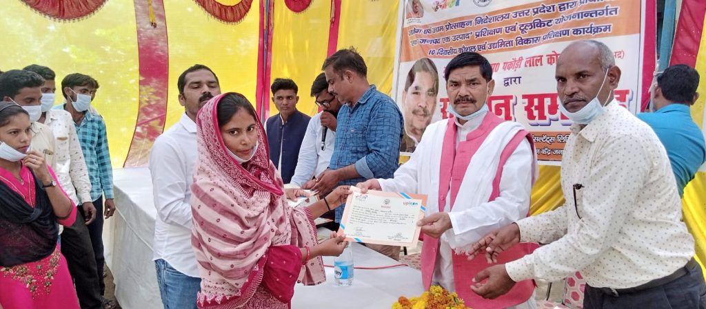 जिससे वह प्रशिक्षित होकर अच्छे से अपना काम कर सके और आगे चलकर अपना रोजगार बढ़ा सकें प्रशिक्षण दिनांक 19 अगस्त 2021 से 29 अगस्त 2022 तक चला था इसका समापन समारोह और सर्टिफिकेट वितरण का कार्यक्रम सांसद पकौड़ी लाल कोल के कर कमलों से करवाया गया सांसद ने लोगों को भरोसा दिलाया कि वह जल्द ही इस क्षेत्र में कालीन से संबंधित कामों को तेजी दिलाने का प्रयास करेंगे ताकि लोगों को अपने घर क्षेत्र को छोड़कर अन्य जगहों पर कालीन का काम करने ना जाना पड़े वह घर पर ही रह कर अपना रोजी रोजगार को आगे बढ़ाएं इस मौके पर मुख्य अतिथि सांसद पकौड़ी लाल कोल जिला उद्योग कार्यालय के जिला उपायुक्त पी गौतम यूपीको के एमआईएस आरडी सिंह उत्तर प्रदेश कौशल विकास मिशन के एमआईएस निशांत ओझा कोन थानाध्यक्ष रामनरायन पासी ग्राम प्रधान प्रतिनिधि नीलेश राम इनके साथ साथ इस प्रशिक्षण कार्यक्रम को कराने में सहयोग करने वाले पंकज कमल कुशवाहा नागवंत भारती राजन जायसवाल शमसुल हक अनिरुद्ध विश्कर्मा जिला उद्योग कार्यालय के तमाम कर्मचारीगण आदि उपस्थित रहे।
